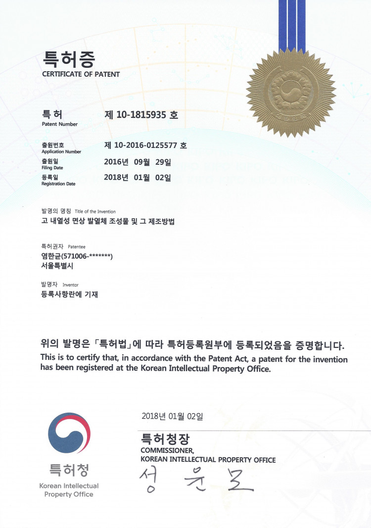 특허증 10-1815935호 페이지 정보 작성자 관리자 댓글 0건 조회 774회 작성일 20-05-11 16:50 이전글 다음글 목록 본문 고 내열성 면상 발열체 조성물 및 그 제조방법 목록 댓글목록 댓글목록 등록된 댓글이 없습니다.