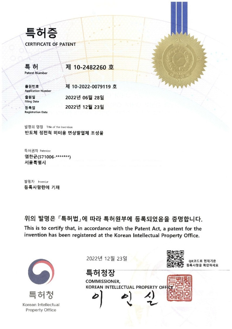 특허증 10-2482260호 페이지 정보 작성자 관리자 댓글 0건 조회 390회 작성일 23-04-04 17:31 다음글 목록 본문 반도체 정전척 히터용 면상발열체 조성물 목록 댓글목록 댓글목록 등록된 댓글이 없습니다.