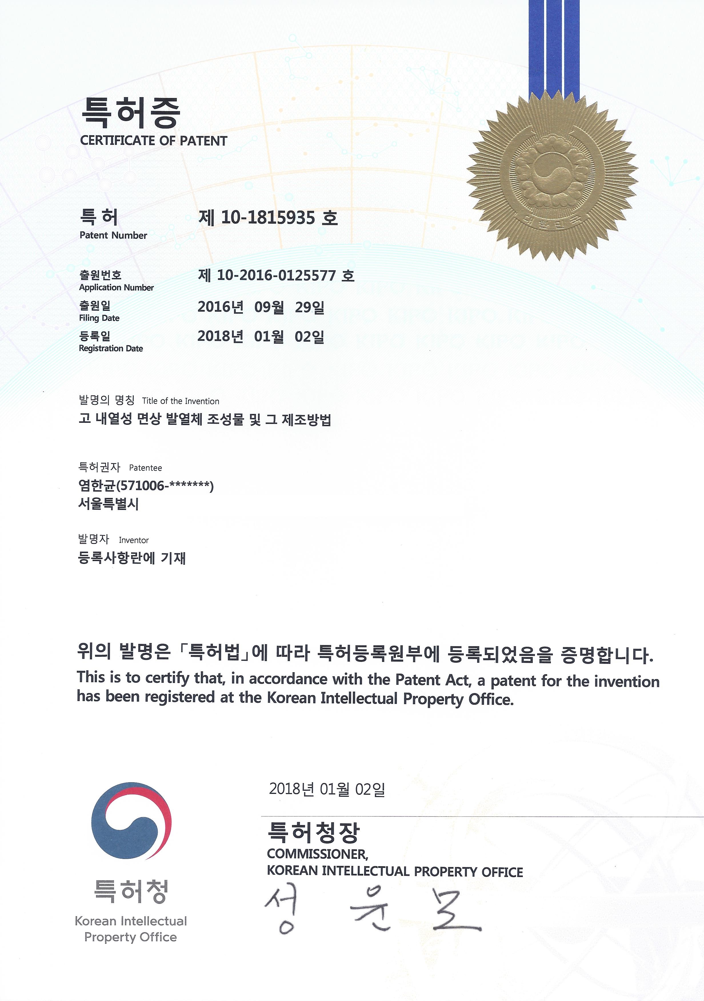 특허증 10-1815935호 Page info Writer 관리자 Comment 0 Hit 495 Date 20-05-11 16:50 Prev Next List Article 고 내열성 면상 발열체 조성물 및 그 제조방법 List Comment 댓글목록 No data.